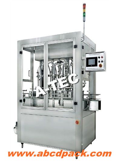 本机适用于各种不含气流体、半流体的定量灌装.自动完成计数进瓶、定量灌装、输送出瓶等一系列操作.特别适用于水剂、乳剂、悬浮剂、食用油、润滑油的定量灌装,是食品、医药、化妆品以及精细化工等行业的理想包装机械. 本机采用可编程序控制器(PLC)进行控制,触摸屏操作,具有调节方便,适用范围广等特点. 本机采用先进的机电一体化技术,能在触摸屏中修改参数,对每一个头的灌装量进行单个微量调整. 3.应用触摸屏技术,使机器的操作更可靠,方便,人机界面更加友好.光电传感器,接近开关等采用的都是先进传感元件,做到无瓶不灌装,堵瓶主机会自动停机并报警. 4.灌装方式为下潜式,选用不同材质密封活塞环,可以满足不同特性物料的灌装. 5.整机按GMP标准要求制作,各管路连接采用快装方式,拆卸清洗方便快捷,与物料接触部位及外漏部分采用优质不锈钢材料制造.整机安全,环保,卫生,美观,能适应各种不同环境的工作。