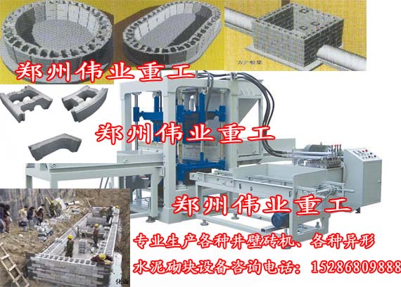 井壁模块设备广泛适用于煤、热、水、电、气等市政地下构筑物的新型砌筑材料。如:排水、储水设施的各类检查井、雨水口、方沟、化粪池及小型构筑物、桥梁翼墙等。井壁砌块模块化:圆形检查井的弧型模块基本尺寸是将井型整体分割,形成单元模块尺寸规格,用几种形式的模块即可满足各类井型的需要,模块已系列化。本机采用振动加压成型工艺,其优点是:制品外观整齐、颗粒均匀、尺寸准确、结构密实、成型效率高、水泥用量少、降低成本、成型后可立即脱模。本生产线,各部位配合紧密。故障率低有效的提高了生产效率。全自动PLC控制更快捷,更稳定,操作简单方便。其优点是:制品外观整齐、颗粒均匀、尺寸准确、结构实、成型效率高、水泥用量少、降低成本、成型后可立即脱模。独特的外置式振动器调节装置及进口变频系统的加装,使振幅(激振力)的调节十分的方便,从而可获得各种轻、重物料的最佳的成型效果。出坯系统采用链条输送,使砌块坯体传出时绝对的平稳、无内伤,从而能满足各种物料坯体对系统的不同需求,保证了出坯100%的合格率。在诸多的工况下,设备技术状况可以调节到最佳状态。井壁墙体模块砖机造型美观大方,使用可靠,维修方便。可实现联动操作,极大减轻了操作人员的劳动强度。窨井壁砖设备 窨井砖机 盲井壁砖机械 盲井砖机设备咨询电话:15286809888 技术热线:0371-64426188