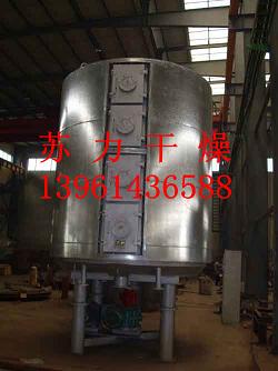 湿物料自加料器连续地加到干燥器上部第一层干燥盘上,带有耙叶的耙臂作回转运动使耙臂作回转运动使耙叶连续地翻抄物料。物料沿指数螺旋线流过干燥盘表面,在小干燥盘上的物料被移送到外缘,并在外缘落到下方的大干燥盘外缘,在大干盘上物料向里移动并从中间落料口落如下一层小干燥盘中。大小干燥盘上下交替排列,物料得以连续地流过整个干燥器。中空的干燥盘内通入加热介质,加热介质形式有饱和蒸汽、热水、导热油和高温熔盐,加热介质由干燥盘的一端进入,从另一端导出。已干物料从最后一层干燥盘落到壳体的底层,最后被耙叶移送到出料口排出。湿份从物料中溢出,由设在顶盖上的排湿口排出,真空型盘式干燥器的湿气由设在顶盖上的真空泵口排出。从底层排出的干物料可直接包装。通过配加翅片加热器、溶剂回收冷凝器、袋式除尘器、干料返混机构、引风机等辅机,可提高其干燥的生产能力,干燥膏糊状和热敏性物料,可方便地回收溶剂,并能进行热解和反应操作。