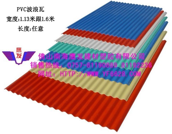 鹰发牌pvc波浪瓦、pvc塑料瓦、pvc塑钢瓦引进先进的生产设备和产品技术,用自己独特的专利配方生产出各种优质,色彩鲜艳,不易变色的pvc波浪瓦,自本厂成立以来,产品畅销全国各地。Pvc波浪瓦、pvc塑料瓦、pvc塑钢瓦:具有轻质、防水、坚韧、保温隔热、隔音、抗腐蚀、耐酸耐碱、抗风防震、抗冰雹、抗污。本厂1.5米和1.6米大规格瓦,省叠口,节省成本专家。